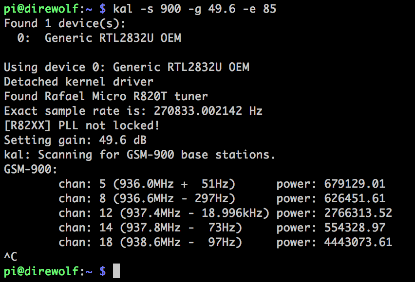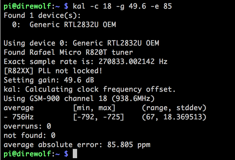 Use the rough ppm offset as input for Kalibrate-rtl (in this sample +85ppm) and use `kal` to scan for an usable and local GSM frequency band using gain and the rough ppm value. Use 850MHz for America and 900MHz for Europe. Note the added maximum gain value.